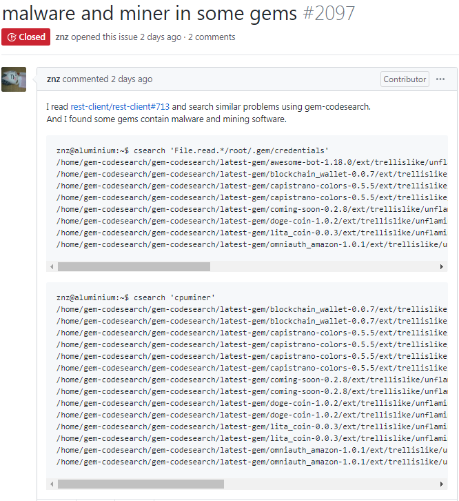 RubyGems 工作人员在后续的一次调查中发现,这种机制被滥用并植入了加密货币的挖矿代码,然后又在另外 10 个项目中发现了类似的代码。