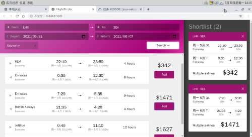 下图是在 LoongArch64 平台运行 GitHub 上一个使用 ASP.NET Core 开发的开源项目 FlightFinder,查询航班信息的截图。
