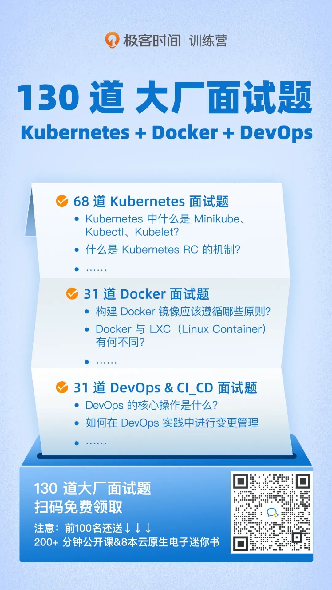 在这里,我整理了 130 道「Kubernetes + Docker + DevOps」的大厂面试题及详细解析,通过这些面试题带你了解大厂会关注工程师哪些技术点,为你提供一个学习的方向。