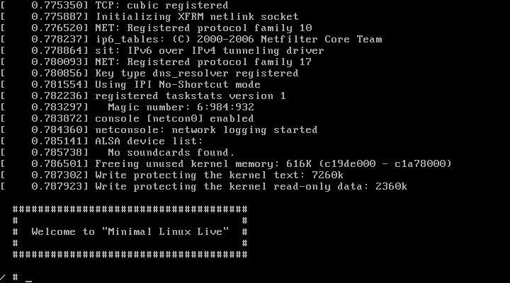 生成的ISO镜像文件包括使用默认选项编译的linux内核,使用默认选项编译的BusyBox和非常轻量级的initramfs。这意味着你不需要 另辟蹊径去获得windows支持,也不需要使用任何花哨的桌面环境。你所需要的只是一个支持BusyBox applets 的shell控制台,和……好吧。这些就够了。这就是为什么称它为 "最精简"。