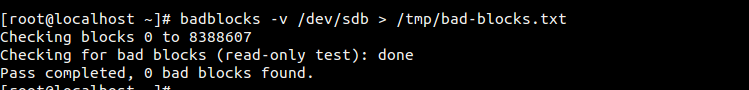# sudo badblocks -v /dev/sdb > /tmp/bad-blocks.txt