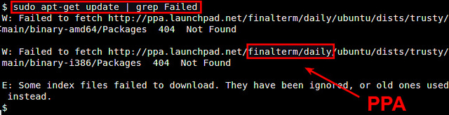 在本例中,Ubuntu Trusty不再支持的PPA仓库是“ppa:finalterm/daily”。