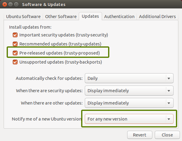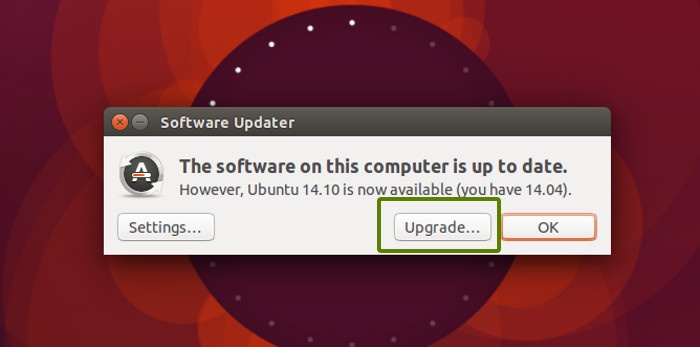在你升级到Ubuntu 14.10之前,请确定你真的想为升级 14.10 而抛弃 Ubuntu 14.04。一个很重要的原因是你不能从Ubuntu 14.10 回归到14.04。 你需要完全重新安装。