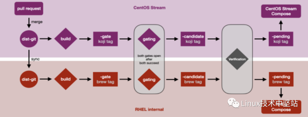 koji标签,而 RHEL 会打上brew标签;同样的代码只有同时通过了 CentOS Stream 和 RHEL 的测试流程,闸门才会开启并让代码进入到下一个候选环节;在候选环节会做代码的验证,同样的,CentOS Stream 和 RHEL 中的代码都必须通过验证,才可以进入到发行版的组合阶段。