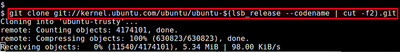 $ sudo apt-get install git $ git clone git://kernel.ubuntu.com/ubuntu/ubuntu-$(lsb_release --codename | cut -f2).git